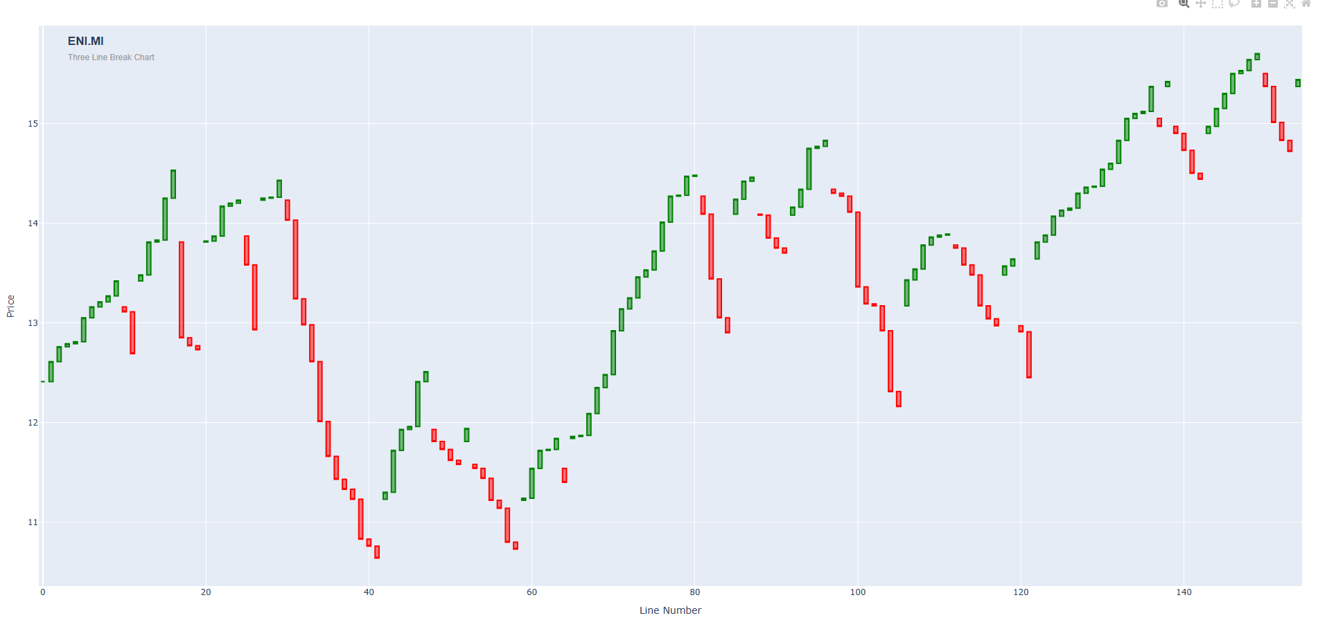 Similmente ai grafici Kagi, i grafici “Three Line Break” sono una tecnica di charting giapponese che filtra il rumore di mercato e aiuta a identificare i trend in modo più chiaro. Le regole per la loro costruzione sono uniche e non sono comunemente supportate dalle librerie di charting standard.