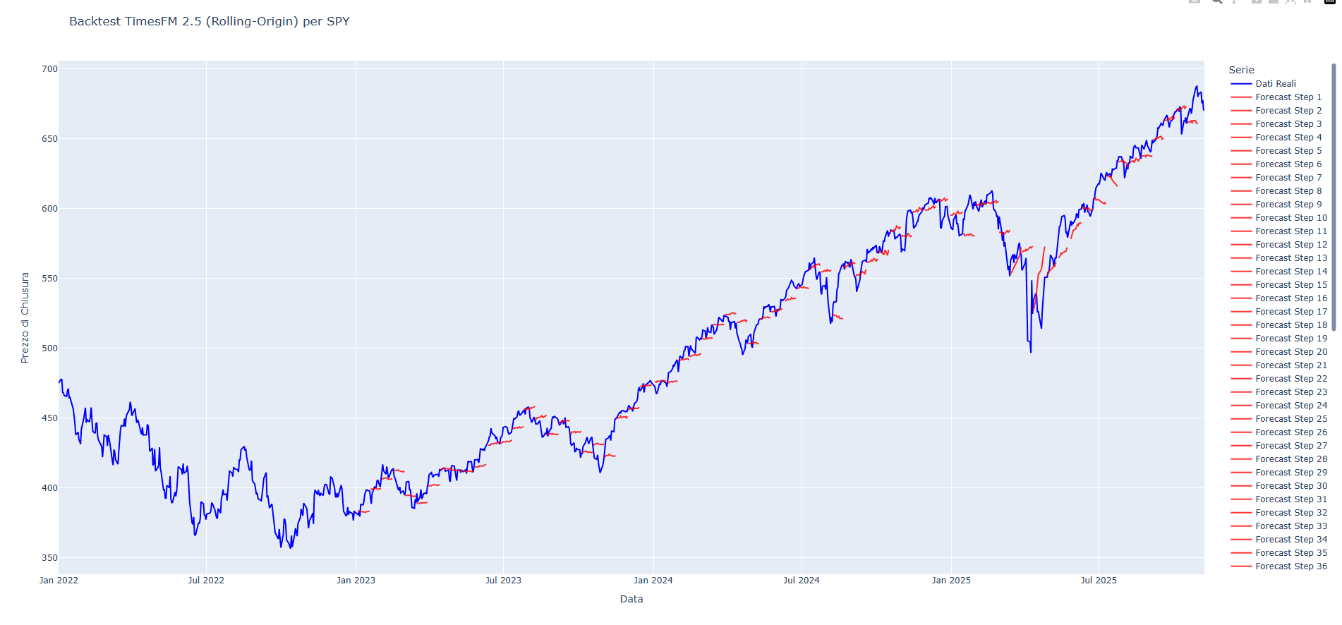 Questo POC è stato creato per rispondere a una domanda critica: “Come si comporterebbe il modello TimesFM 2.5 se lo usassimo continuativamente su dati storici?“. L’obiettivo era sviluppare un prototipo per un motore di backtesting robusto, in grado di misurare le prestazioni del modello non solo in un singolo punto, ma in modo dinamico attraverso diverse condizioni di mercato.