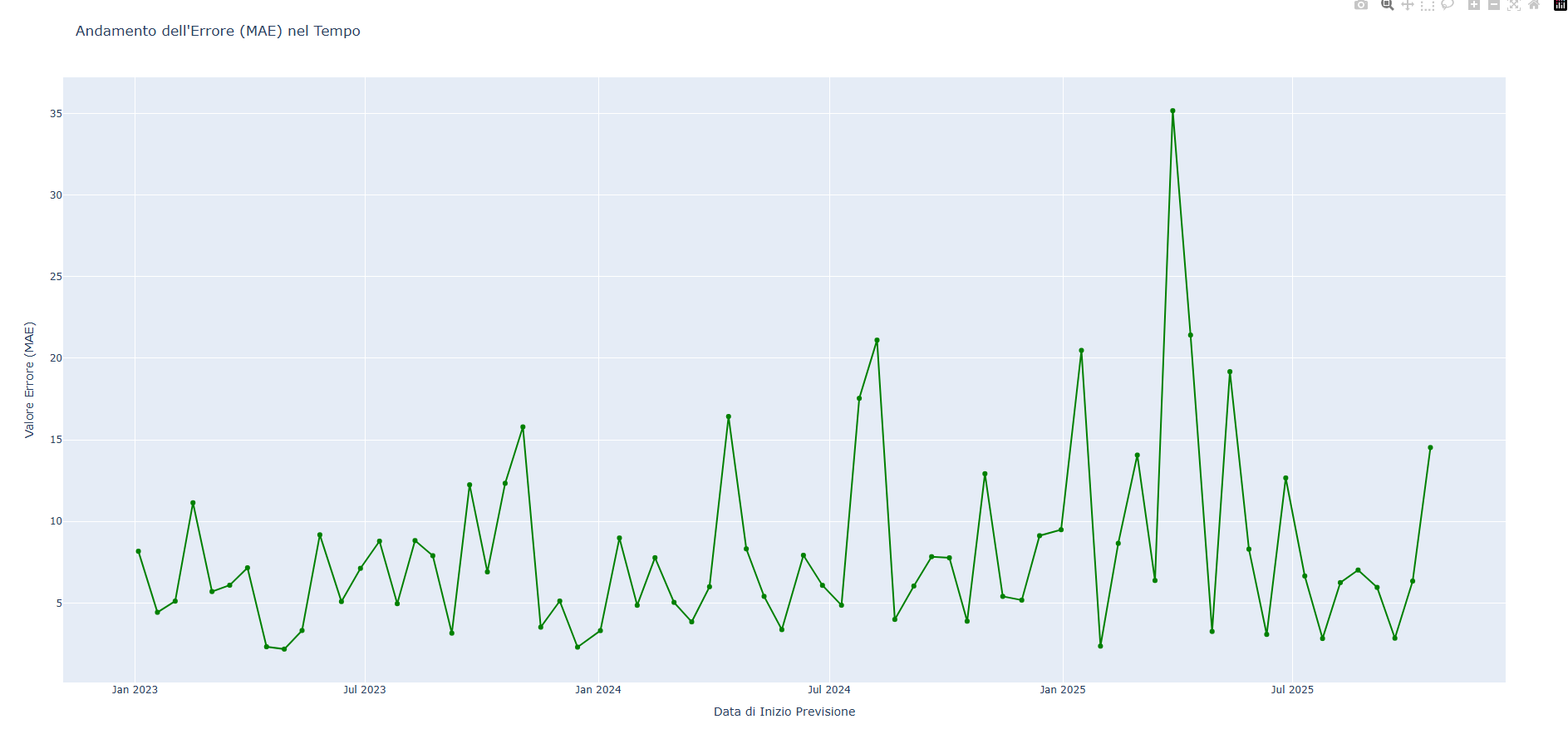 ForecastConfigspecifica. - Analisi dell’Errore nel Tempo: Non si limita a calcolare un singolo valore di errore finale. Invece, calcola e memorizza l’errore (MAE o RMSE) ad ogni step del backtest, permettendo di analizzare se le prestazioni del modello degradano o migliorano nel tempo.