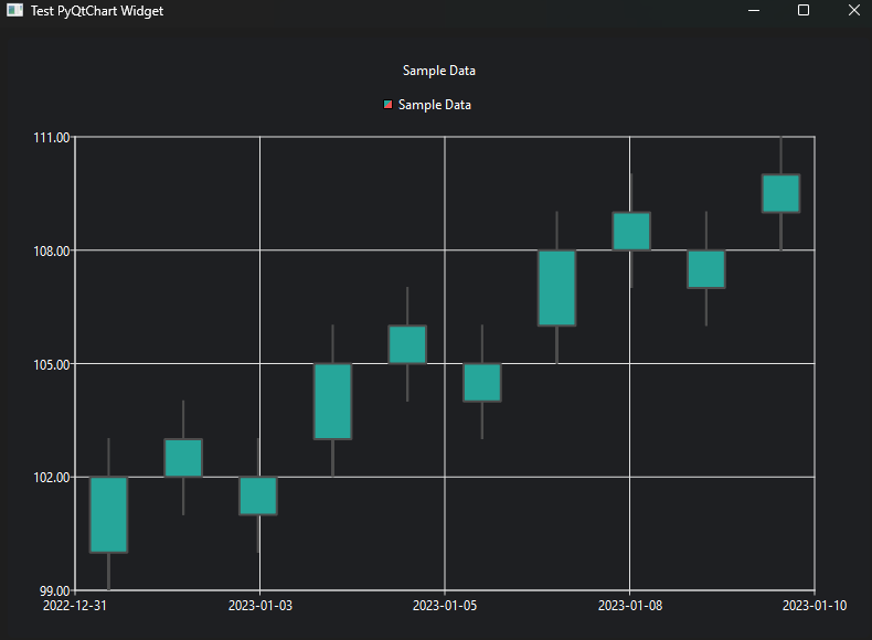 È stato sviluppato un widget di charting sperimentale, PyQtChartWidget, che costruisce un grafico a candele utilizzando le classi native del modulo PySide6.QtCharts.