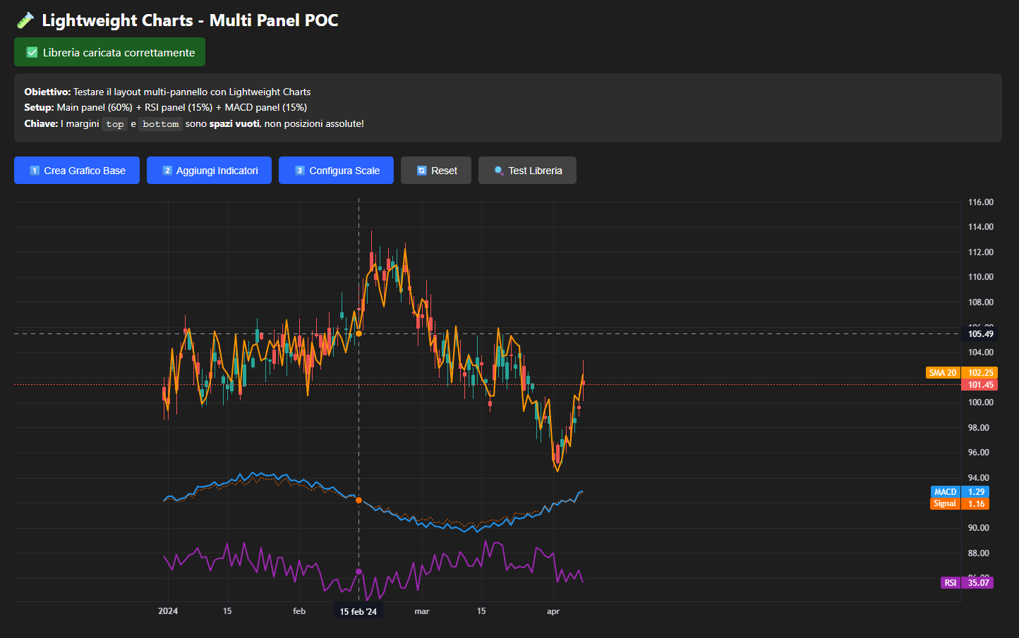 Contesto Durante l’implementazione del layout dinamico multi-pannello, il nostro codice Python, sebbene logicamente corretto, produceva un risultato visivo errato: tutti gli indicatori venivano disegnati sovrapposti sul grafico principale. Questo suggeriva un’incomprensione fondamentale dell’API di Lightweight Charts, in particolare riguardo all’ordine delle operazioni e alla configurazione delle scale di prezzo.