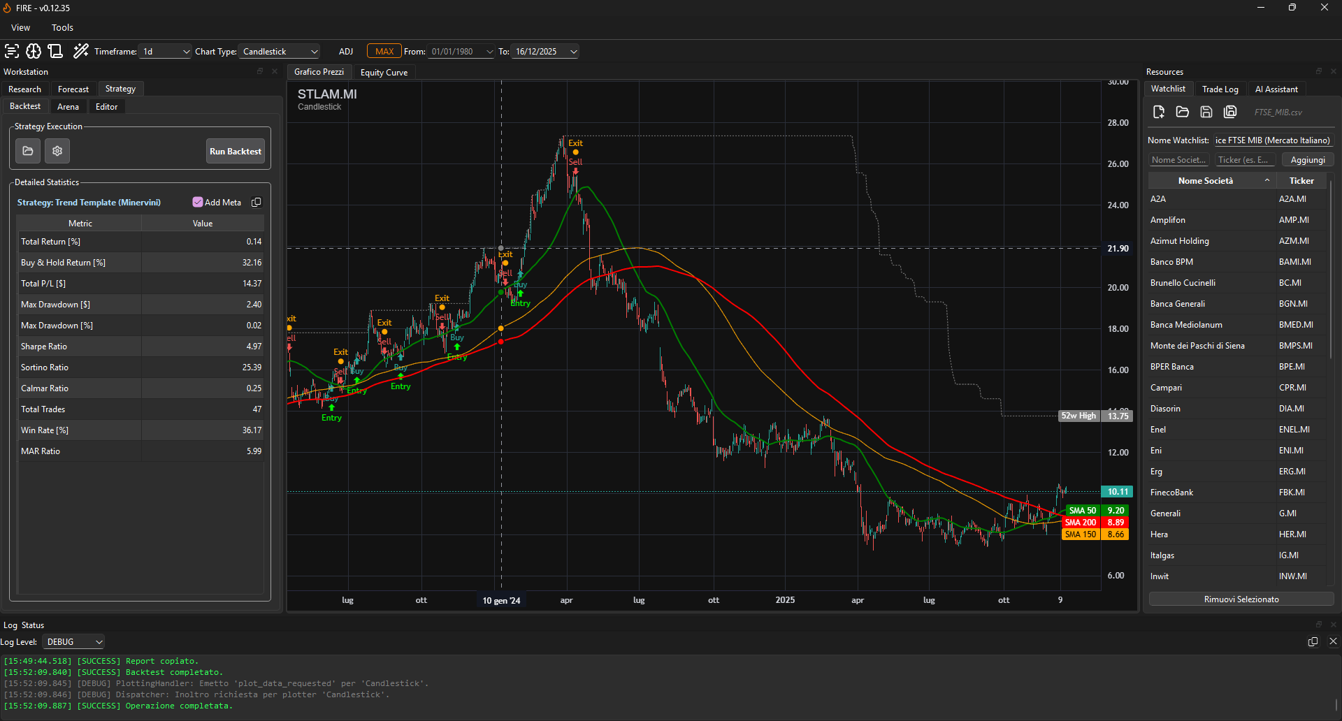 - Forza Relativa (RS): Poiché FIRE analizza un asset alla volta, l’RS Ranking (0-99) è simulato tramite un filtro RSI > 60, che garantisce un momentum interno forte.