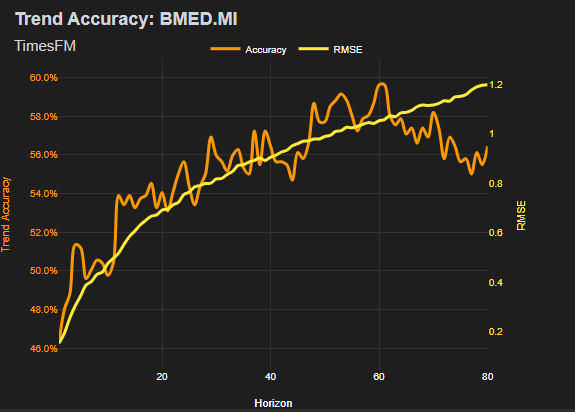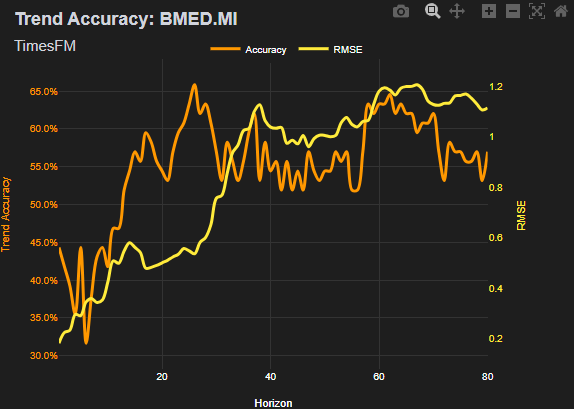 Parametri utilizzati: Serie storica: MAX Model: TimesFM Test Mode: Trend Accuracy Max Horizon: 80 bars Initial Window: 252 bars Simulation Step: 80 step