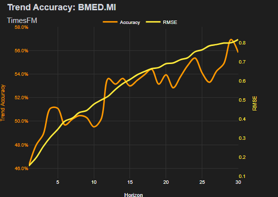 Parametri utilizzati: Serie storica: MAX Model: TimesFM Test Mode: Trend Accuracy Max Horizon: 30 bars Initial Window: 252 bars Simulation Step: 10 step