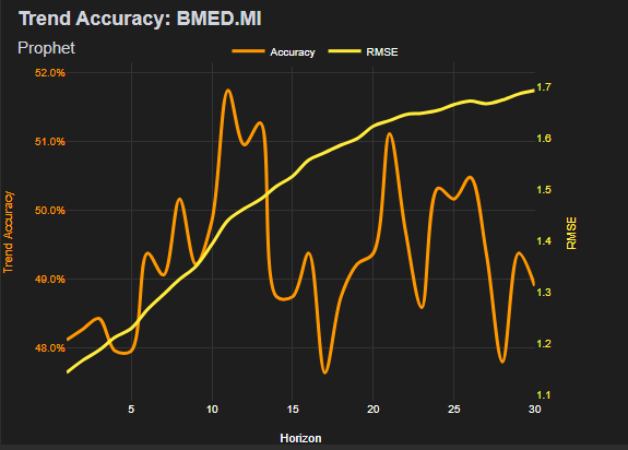 Parametri utilizzati: Serie storica: MAX Model: Prophet Test Mode: Trend Accuracy Max Horizon: 30 bars Initial Window: 252 bars Simulation Step: 10 step